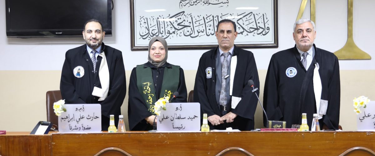 The College of Law at the University of Baghdad witnessed, on Thursday, December 18, 2025, the defense of a Master’s thesis in the Department of Private Law entitled “The Preference of Judicial Evidence in Personal Status Disputes: A Comparative Study,” submitted by the student Rahma Riyadh Jameel.
